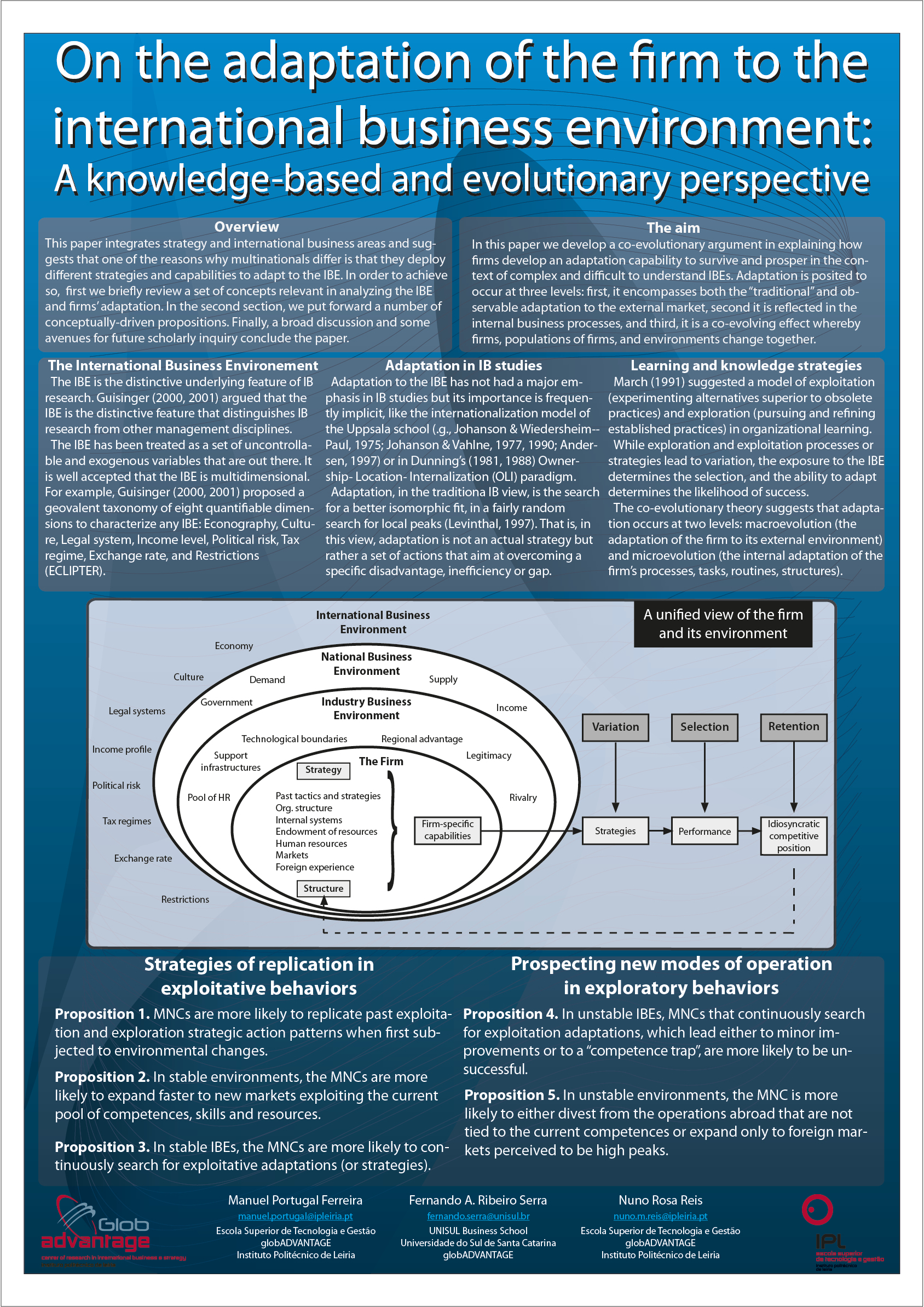 This paper advances on the importance of the adaptation of the firm to the International Business Environment (IBE). The IBE is a distinguishing factor in international business studies and the firm’s adaptation to the environment has been presented as a basic survival strategy. We argue that adaptation is indeed a dynamic and largely internally driven process that leads the firm to co-evolve with the external environment. The ability to adapt to different international business environments is developed over time through the firm’s experiences and built into its routines. Adaptation is both suggested to incorporate the elements of a planned strategy and of random variation in search for local peaks given bounded rationality, imperfect information and the current pool of resources and capabilities. The ability to adapt to the environment may be conceptualized as a knowledge-based capability and a potential source of competitive advantage for the multinational corporation.